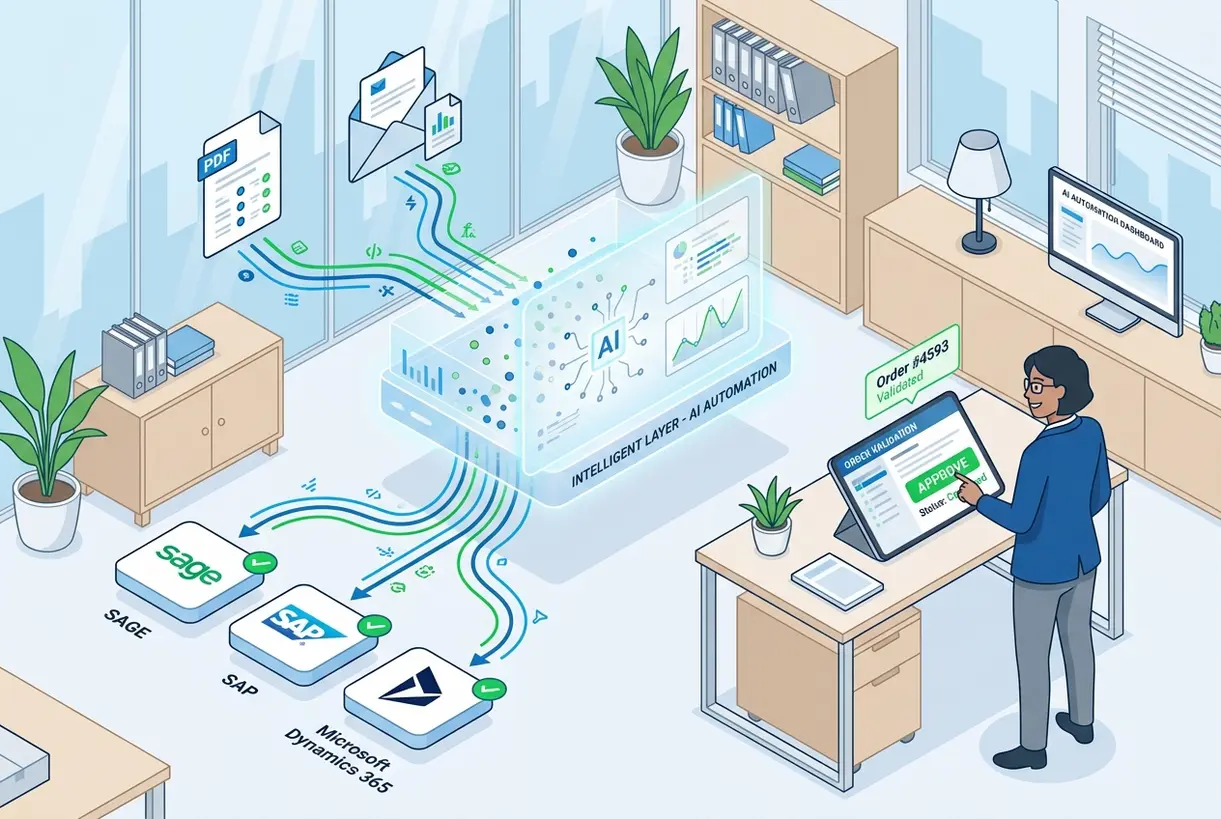 Éliminez les erreurs et gagnez des heures sur la saisie de commandes dans votre ERP (Sage, SAP, Microsoft Dynamics). Découvrez comment automatiser le processus sans refonte IT grâce à une solution simple et rapide.