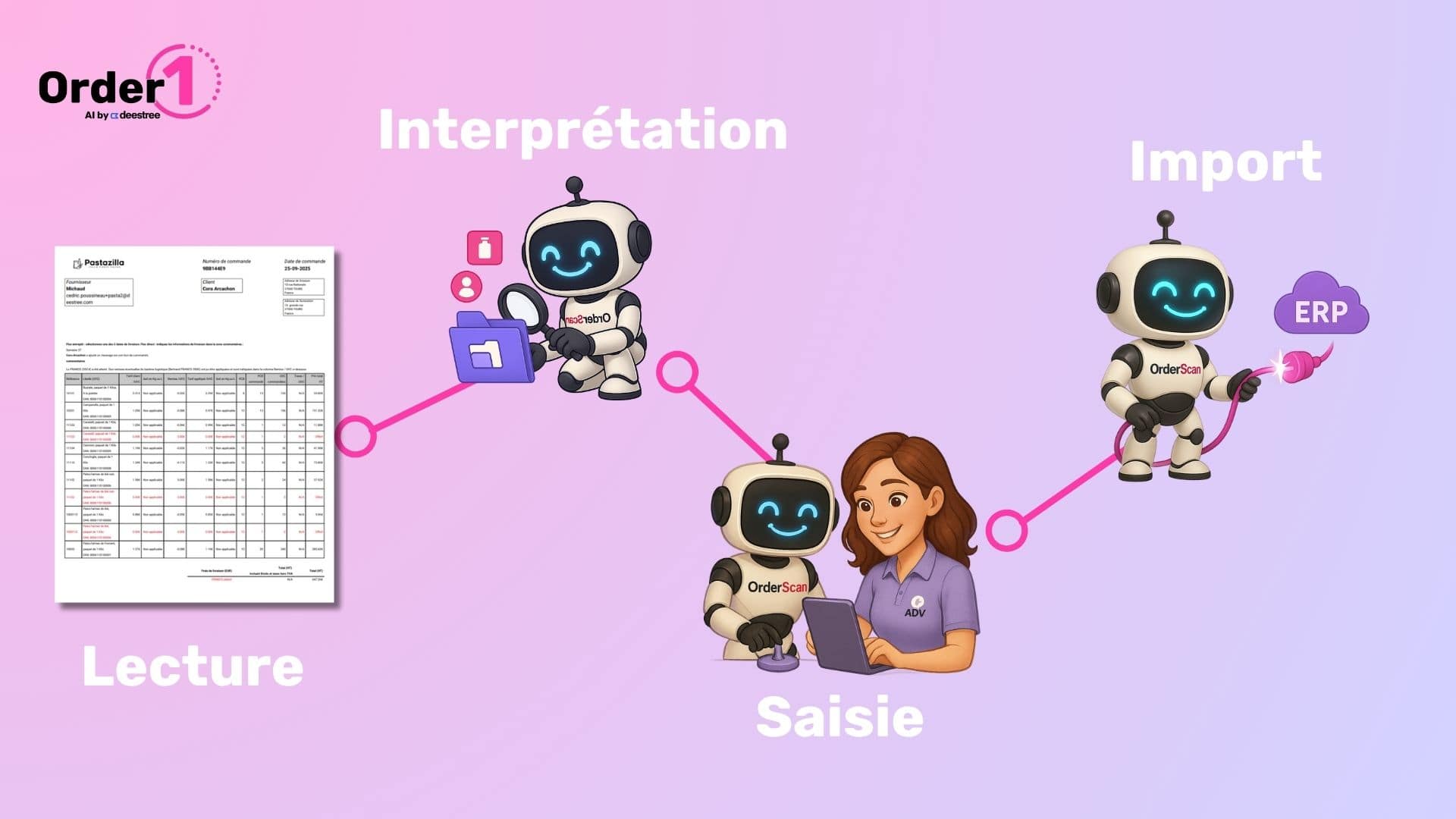 OrderScan lit, interprète et saisit automatiquement les bons de commande reçus par e-mail, PDF ou Excel, pour les intégrer directement dans votre ERP, sans saisie manuelle.